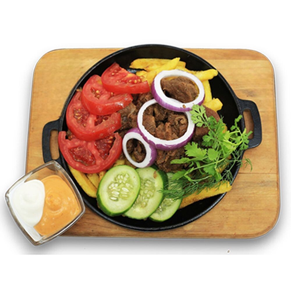 Картофель фри – 200 г, мясо – 100 г, помидор, огурец, зелень, лук, сырный соус