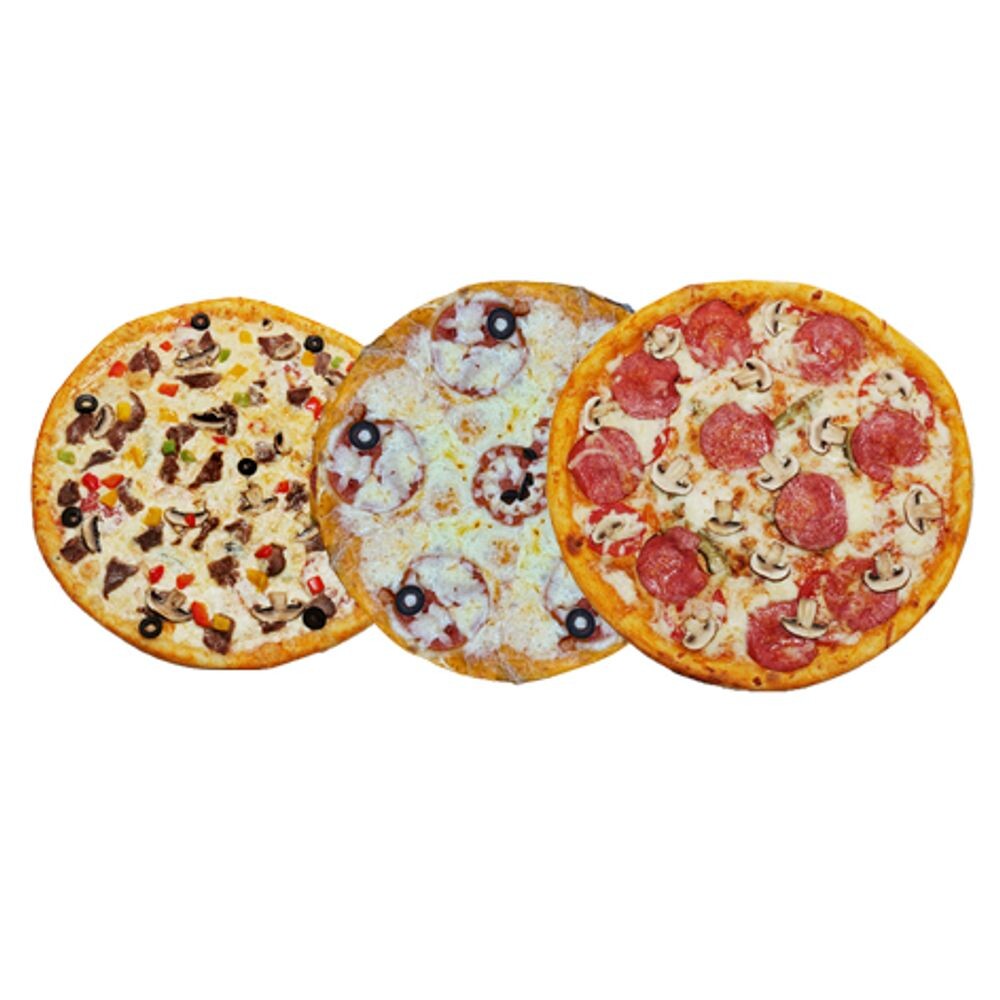 🍕 3 пиццы — 28 см Состав: Тесто Помидор Солёный огурец Сыр Говядина Шампиньоны Болгарский перец Колбаса Оливки