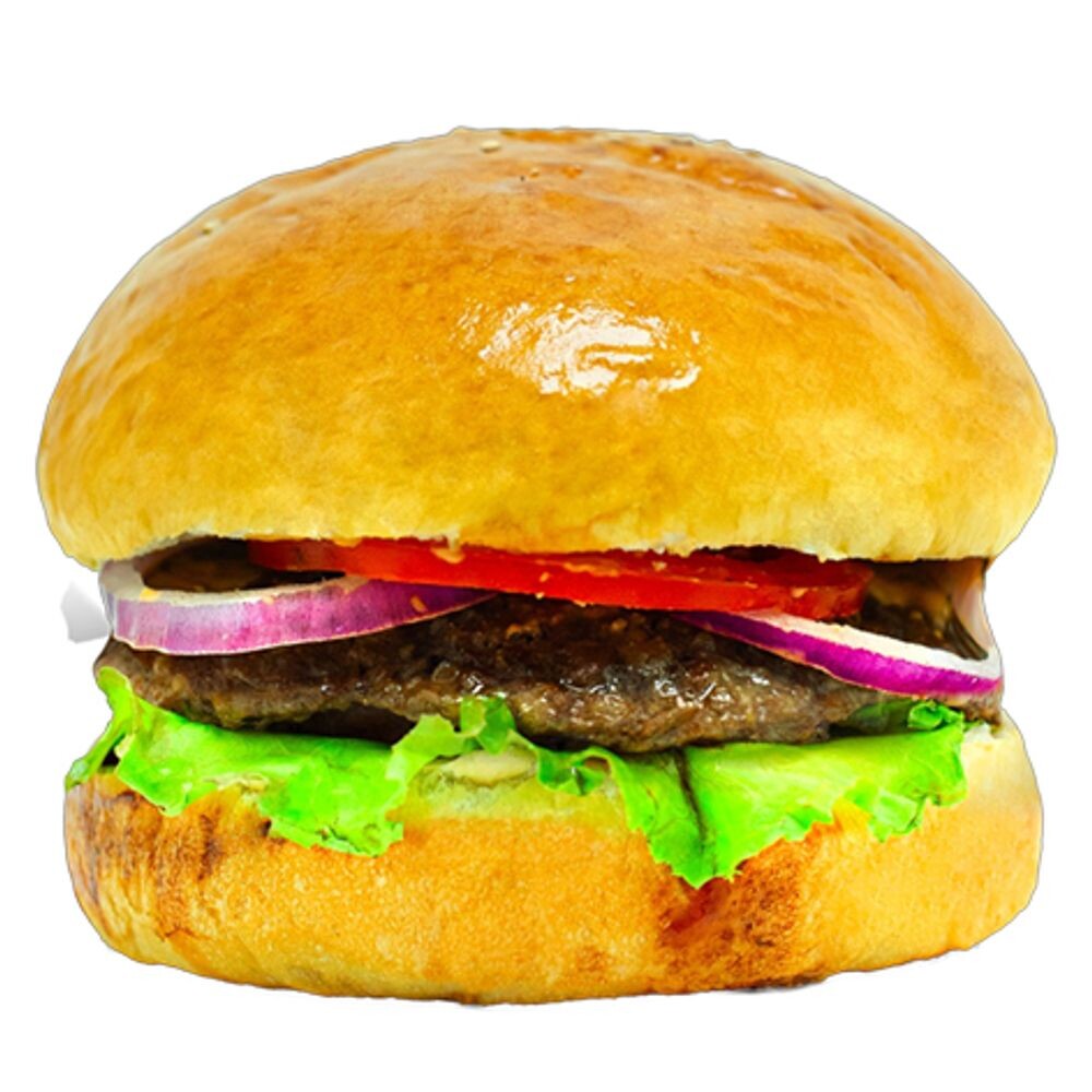 ( Вес 245 г )Булочка, сырный соус, салатный лист, помидор, лук, котлеты, солёные огурцы, барбекю соус.