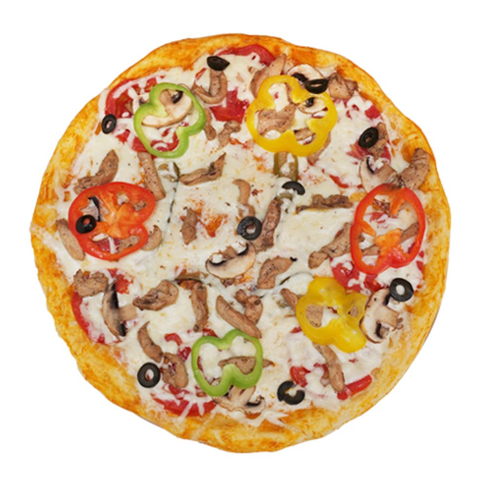 (35 cm вес 780 г ) Шампиньоны, болгарский перец, Куриное мясо, сыр моцарелла, солёные огурцы, помидор, томатный соус, тесто.