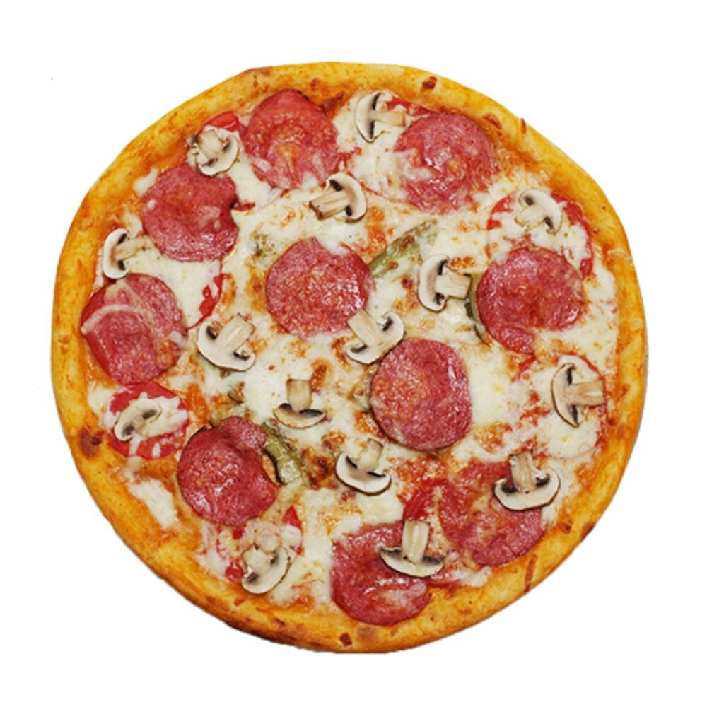 (35 cm вес 780 г ) Шампиньоны, болгарский перец, колбаса, сыр моцарелла, солёные огурцы, помидор, томатный соус, тесто.