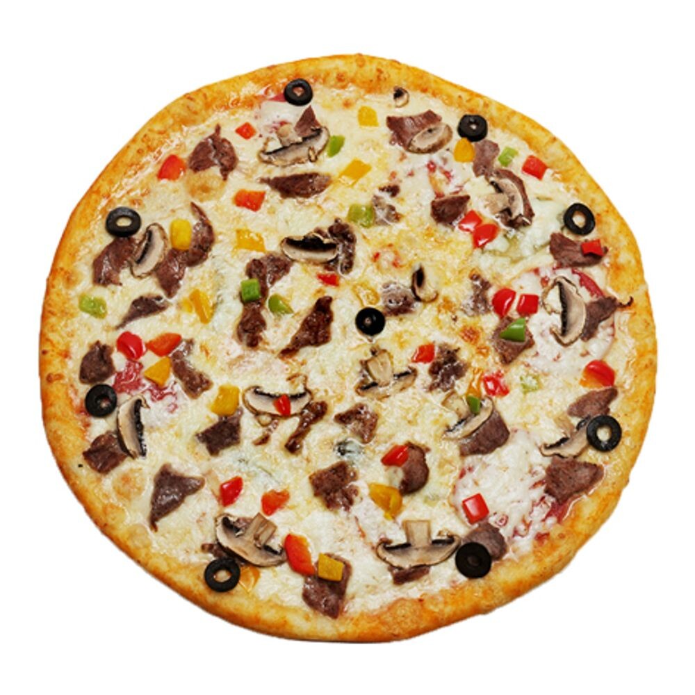 (35 cm вес 780 г ) Шампиньоны, болгарский перец, мясо, сыр моцарелла, солёные огурцы, помидор, томатный соус, тесто.